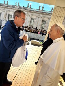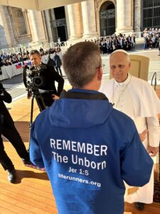 Dr. Castle and three fellow Life Runners arrived at the audience and were seated in the second row, only a few feet from the Holy Father. As he took his place, Dr. Castle reflected on the road that had brought him there. He had once served as a military officer, sworn to defend his country. Now, he serves on a different front line, standing in peaceful witness outside abortion facilities, confronting grave, moral evil.